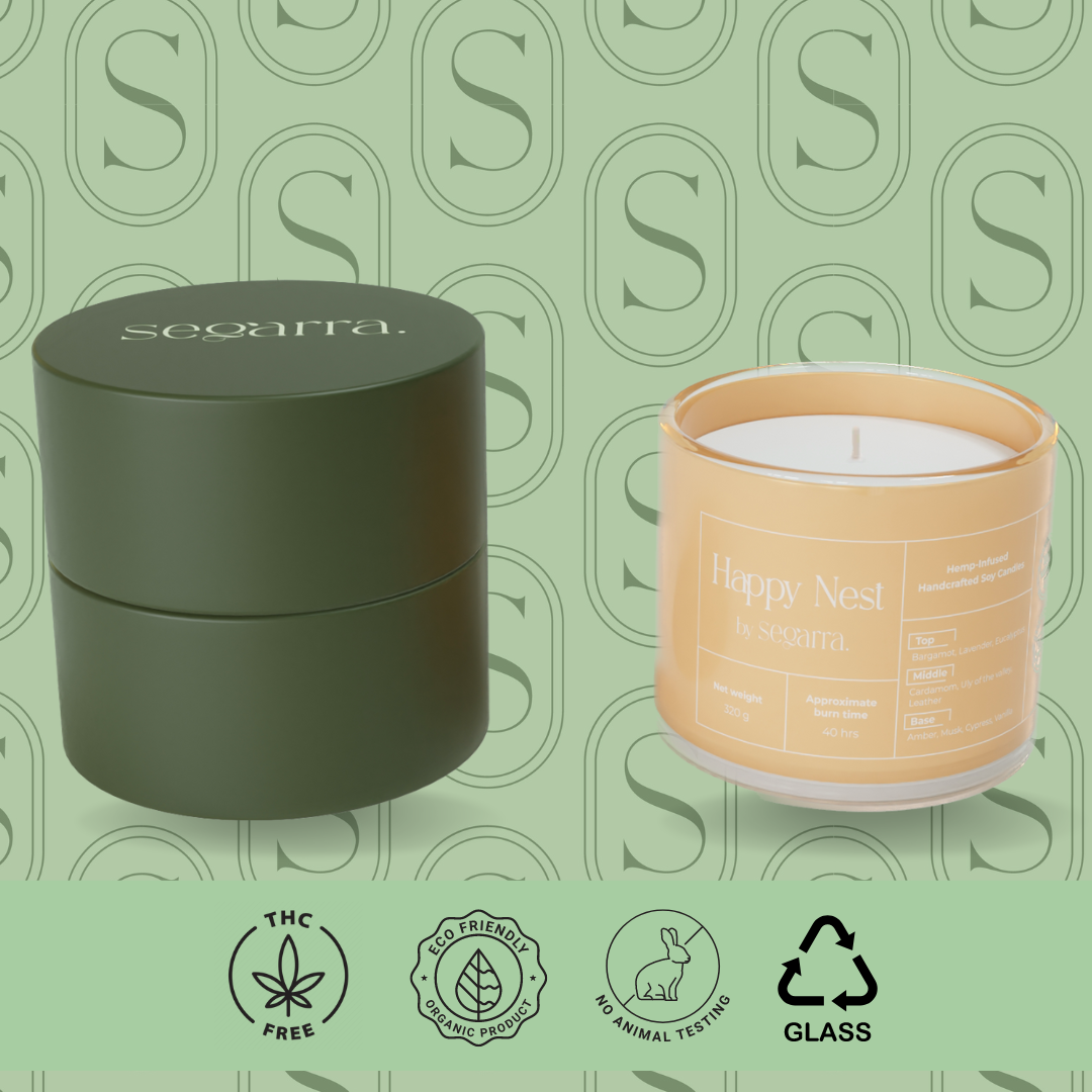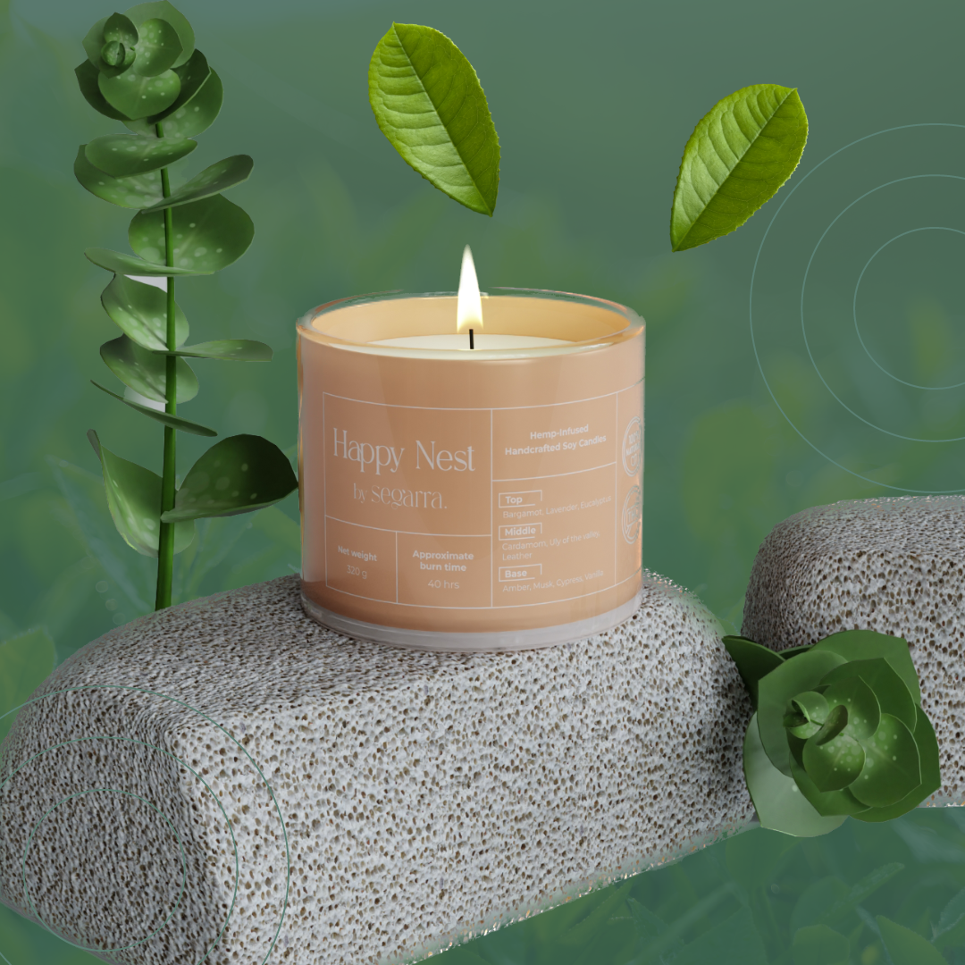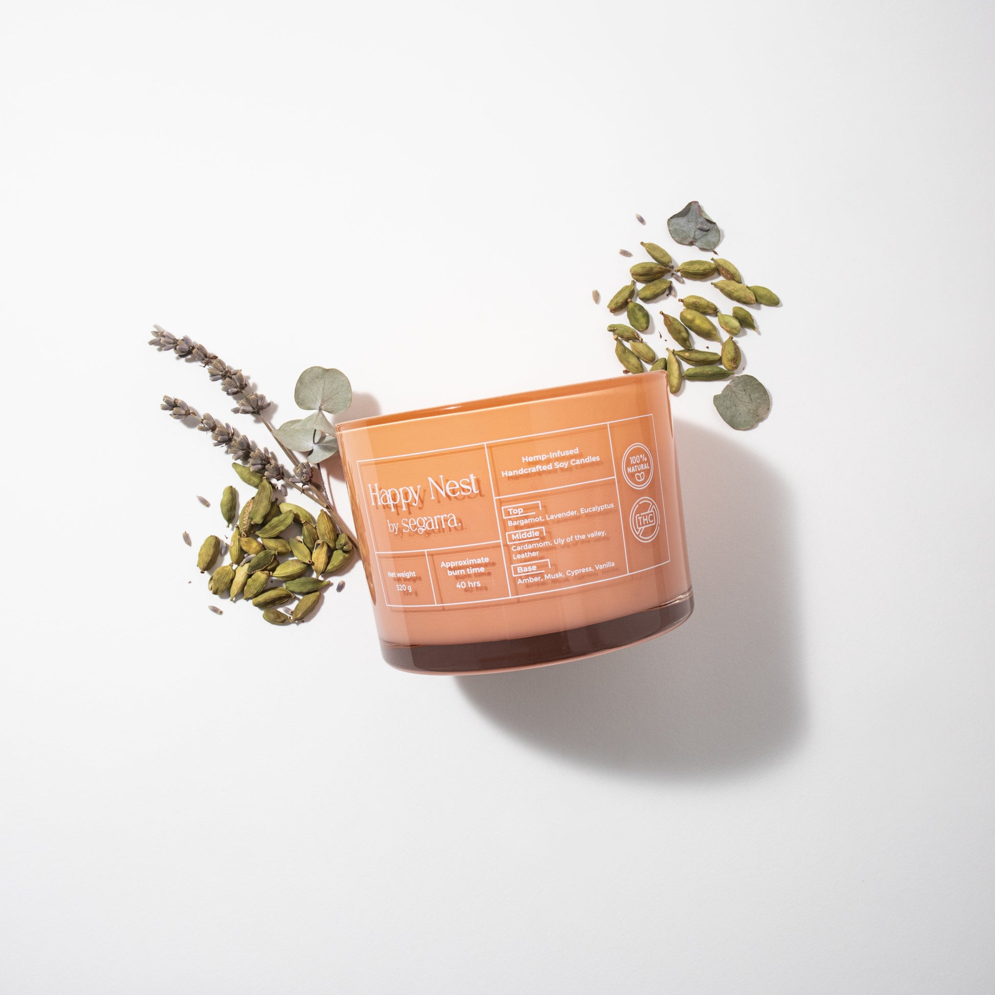 Experience the enchantment of our Happy Nest candle, crafted to celebrate a comfortable home. Discover carefully curated scents, from refreshing bergamot, lavender, and eucalyptus top notes to a warm blend of cardamom, lily of the valley, and leather. The rich base notes of amber, musk, cypress, and vanilla create a complex and inviting aroma. Infused with the natural benefits of hemp, our candle promotes relaxation and a sense of well-being. Create a soothing atmosphere and embrace the joy.